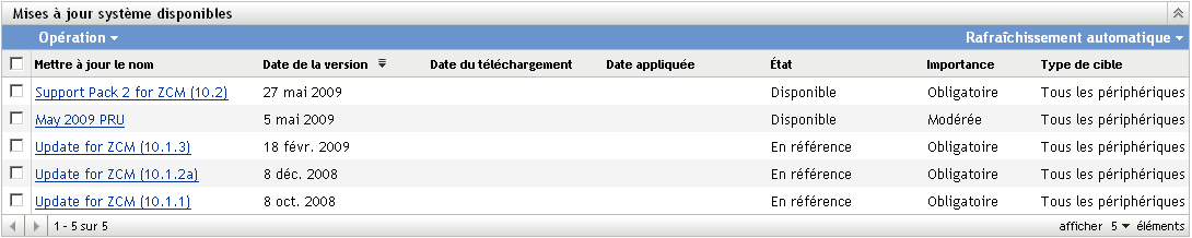 Affiche l'importance relative du contenu de la mise à jour pour votre installation ZENworks. Voici quelques entrées possibles : FACULTATIF : non requis pour le fonctionnement normal de ZENworks. OBLIGATOIRE : une mise à jour obligatoire doit être appliquée. |