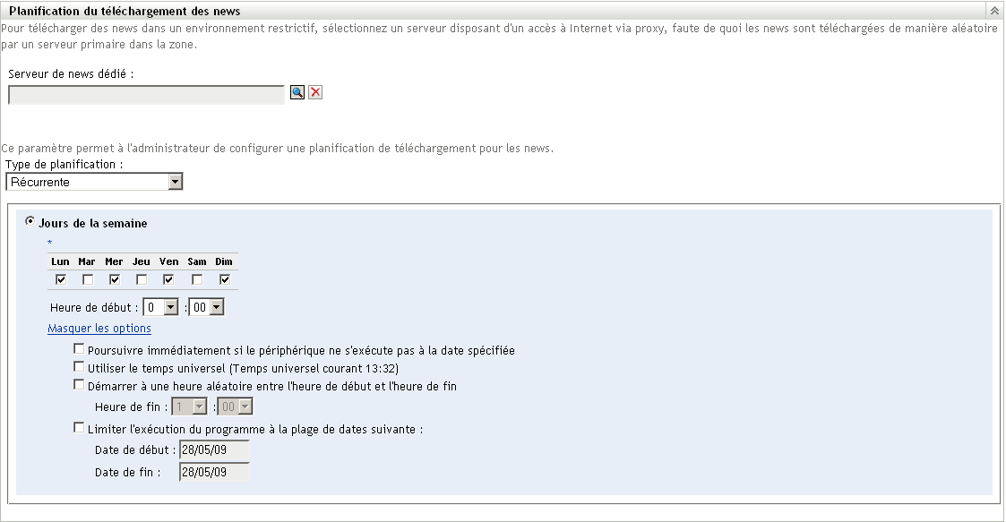Poursuivre immédiatement si le périphérique ne s'exécute pas à la date spécifiée : provoque la vérification des mises à jour des news dès que possible si cette vérification ne peut pas s'effectuer conformément à la planification. Par exemple, si un serveur est arrêté à l'heure prévue pour la vérification des mises à jour des news, celle-ci reprend dès qu'il redémarre.