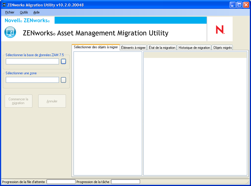 Lorsque vous vous loguez à l'utilitaire de migration Novell® ZENworks® 10 Asset Management, la console de migration s'affiche.