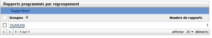 La page Rapports programmés par regroupement s'ouvre et affiche les rapports regroupés par date ou titre, ainsi que le nombre de rapports.