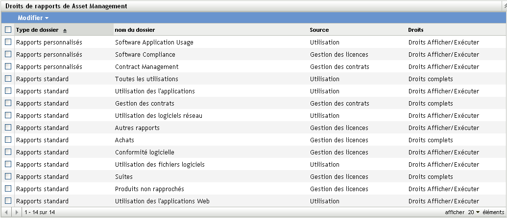 ZENworks® Asset Management vous permet de gérer les droits d'administrateur pour chaque dossier de rapports. Les droits associés à chaque dossier s'appliquent à l'ensemble des rapports de ce dossier. Par exemple, si vous disposez de droits complets pour un dossier, vous pouvez modifier les rapports qu'il contient, alors que si vous avez les droits Afficher/Exécuter, vous pouvez uniquement afficher et exécuter ces rapports.