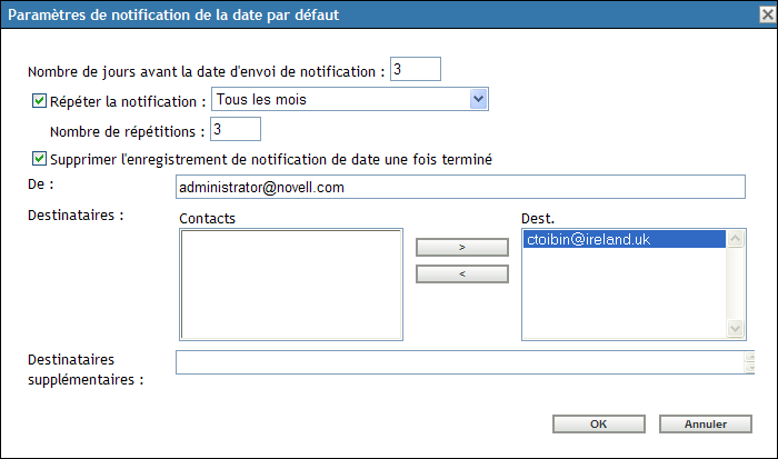 Destinataires supplémentaires : vous devez ajouter au moins un destinataire par défaut. Pour ce faire, vous pouvez utiliser ce champ ou celui intitulé . Pour utiliser ce champ, spécifiez au moins une adresse (par exemple pjones@novell.com). Séparez les adresses par une virgule.