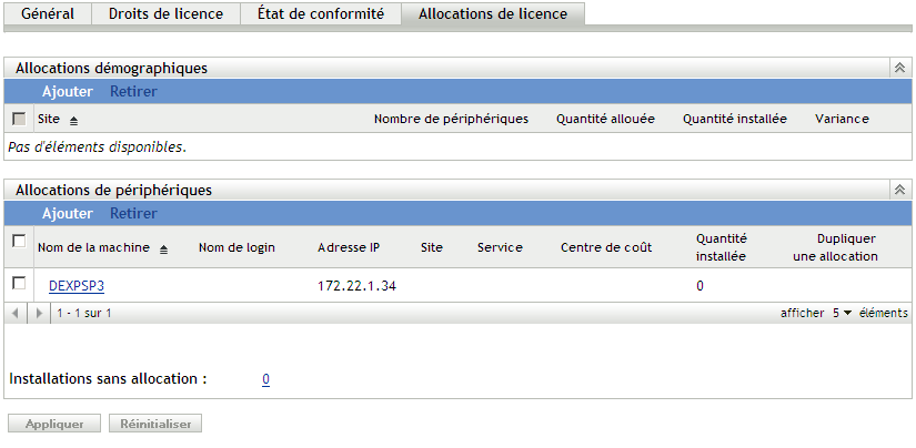 (Facultatif) Pour afficher les périphériques sur lesquels le produit est installé mais auxquels aucune licence n'est allouée, cliquez sur le nombre en regard d' dans le panneau Allocations de périphériques.