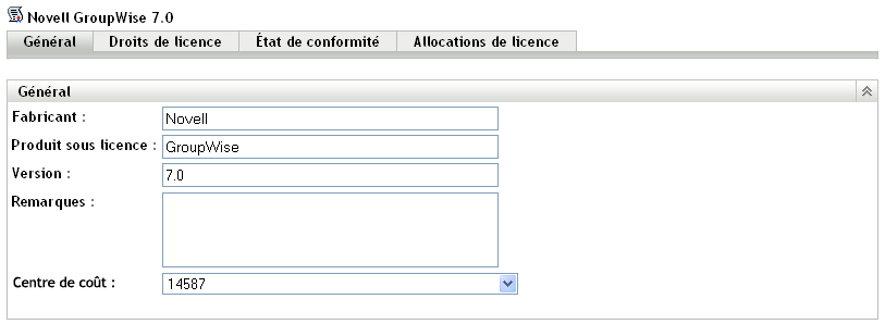Centre de coût : il s'agit d'un champ personnalisé ajouté à titre d'exemple. Il n'est pas inclus dans les informations générales prédéfinies. Vous pouvez ajouter autant de champs personnalisés que vous le souhaitez. Pour plus d'informations, reportez-vous à Section 6.7, Ajout de champs personnalisés à des produits sous licence.