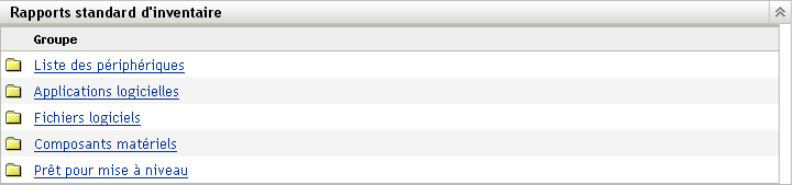 Le Centre de contrôle ZENworks comprend plusieurs rapports prédéfinis que vous pouvez utiliser pour analyser l'inventaire de votre zone de gestion. Ces rapports sont regroupés dans des dossiers selon leur fonction. Les dossiers et rapports disponibles sont les suivants :