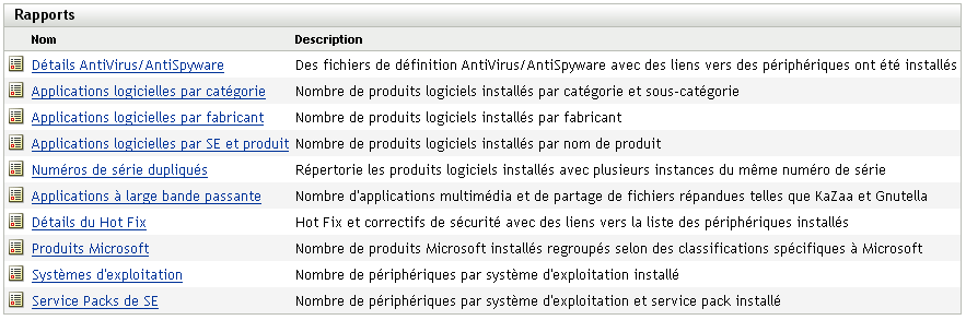 Les rapports sont répertoriés par nom et par description. Pour obtenir une liste des rapports et leurs descriptions, reportez-vous à la Section 8.1.1, Rapports standard disponibles.
