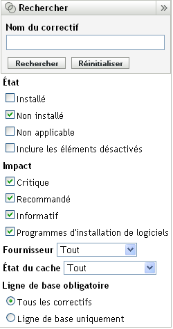 Vous pouvez rechercher des correctifs de la ligne de base obligatoire en fonction des options de filtre suivantes :