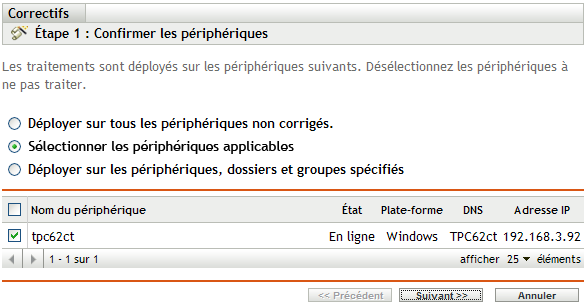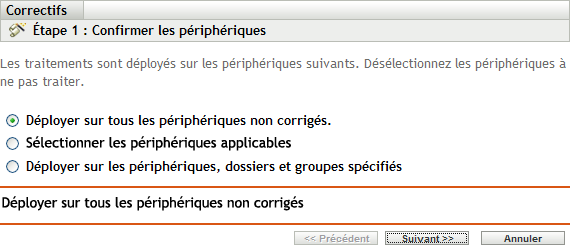 Choisissez pour déployer le correctif sur certains périphériques, dossiers ou groupes non corrigés. Passez ensuite à la Section 5.2.3, Confirmer les périphériques : Sélectionner les périphériques, les dossiers et les groupes.