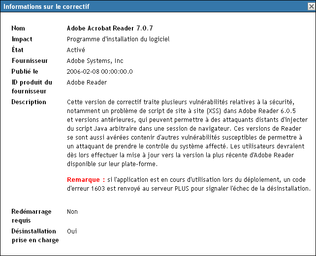 La figure suivante donne un exemple de nom de correctif dans lequel Adobe est le nom du fournisseur, Acrobat Reader, celui de l'application et 6.0.6, le numéro de version :