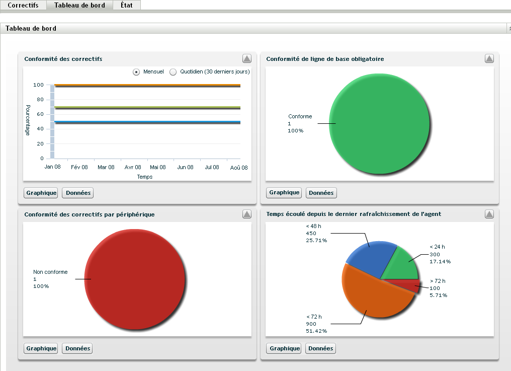 Le tableau de bord répond à des besoins de rapports de conformité, de gestion et opérationnels à l'aide d'un tableau de bord graphique et de quatre rapports standard qui fournissent des informations sur les correctifs, leur déploiement, leur état, les tendances, l'inventaire, etc., et ce pour des machines individuelles ou à des niveaux groupés. Ceci permet de montrer l'évolution en matière d'audit interne et externe ainsi que des exigences de conformité. Vous pouvez mettre à jour le tableau de bord en cliquant sur dans le menu sous l'onglet .