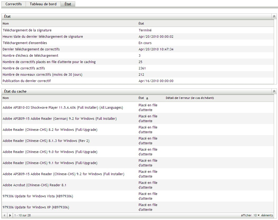 La page État comprend les états du système et du cache, affichant ainsi les informations générales sur les correctifs. Pour plus d'informations, reportez-vous à la Section 4.3, État.