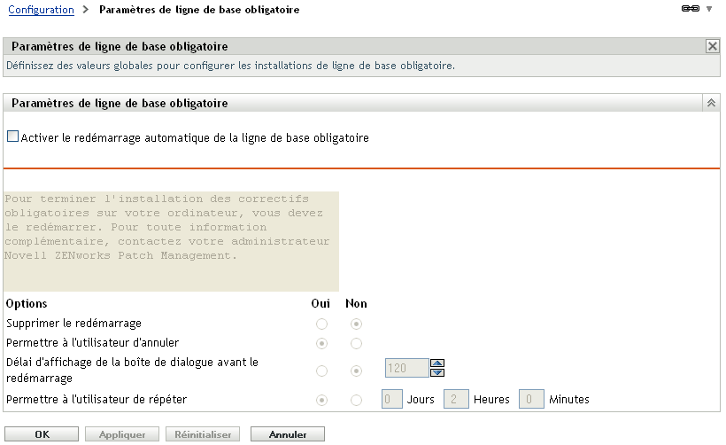 La page Paramètres de ligne de base obligatoire vous permet de contrôler entièrement le déploiement de correctifs de ligne de base obligatoire. Vous pouvez par exemple décider de redémarrer automatiquement ou non la machine lorsqu'un correctif de ligne de base est appliqué. Cette page permet aussi de définir des options globales d'installation de correctifs de ligne de base obligatoires.