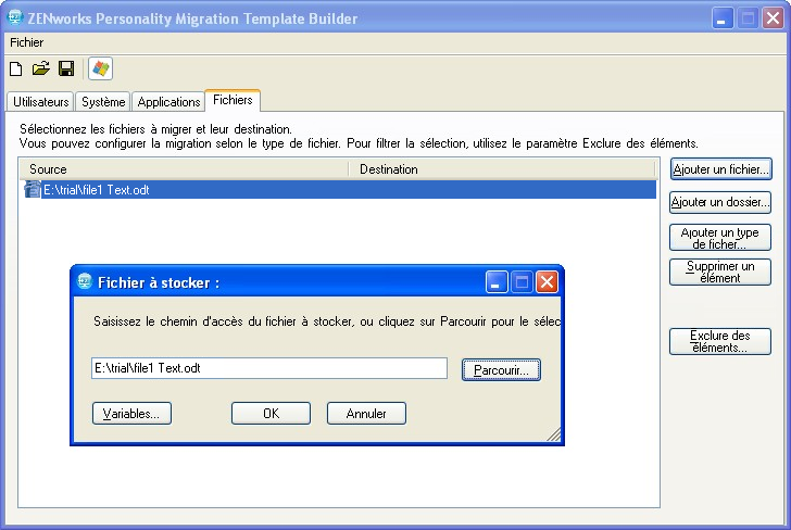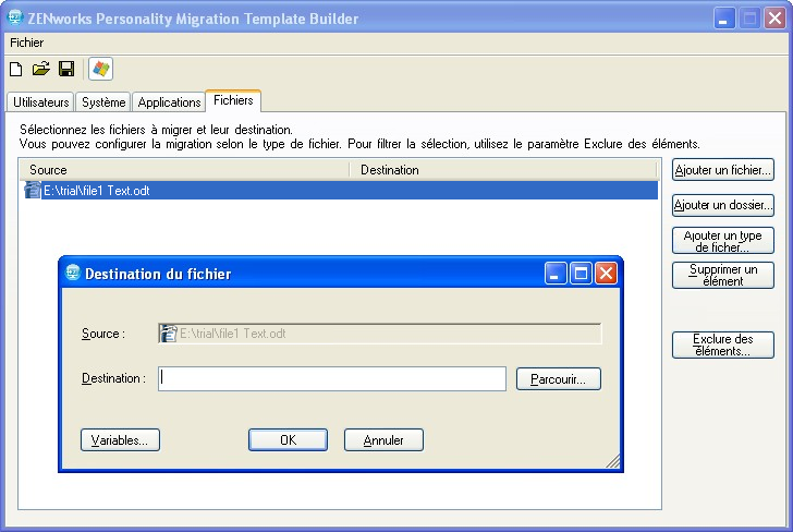Cliquez sur pour sélectionner une variable qui l'assigne à l'emplacement de destination. Par exemple, si vous voulez faire migrer le fichier nommé fichier1 vers le répertoire favoris, cliquez sur la variable et annexez-y \fichier1.