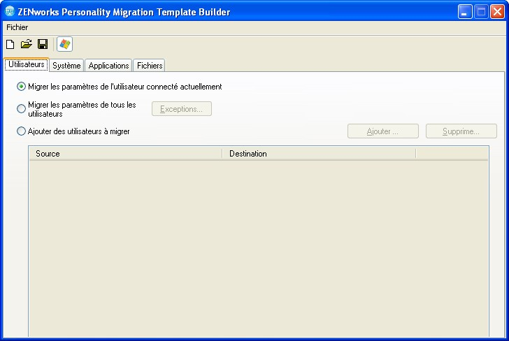 Personality Migration utilise un modèle pour exécuter des migrations automatisées à l'aide des ensembles de directives. Ceci offre une méthode de migration efficace sans passer par l'interface utilisateur de ZENworks Personality Migration à chaque fois que vous voulez exécuter une migration sur une machine spécifique. Veillez à utiliser le même modèle pour le processus de stockage et d'application.