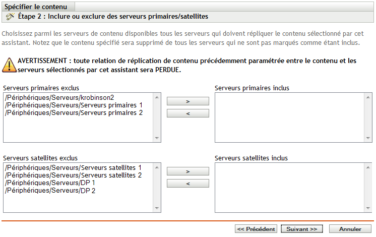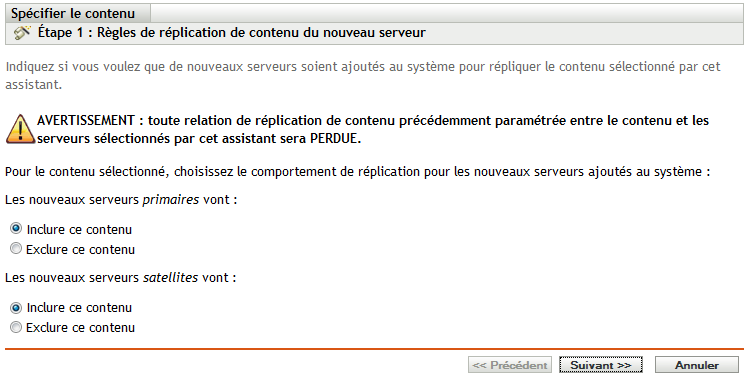 N'oubliez pas que les relations de réplication de contenu déjà définies entre le contenu et les serveurs sont perdues à la fin de cet assistant.