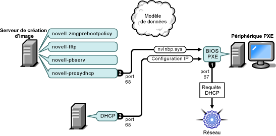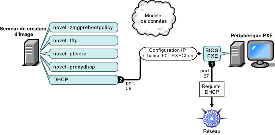 Au démarrage du périphérique, le BIOS PXE émet une requête DHCP avec des extensions PXE. La requête est diffusée sur le port 67.
