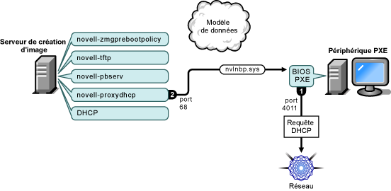 Selon que novell-proxydhcp est configuré sur le même serveur en tant que serveur DHCP standard ou sur un autre serveur, le processus de création d'image débute différemment. Les sections suivantes illustrent le début du processus pour chaque configuration. Les phases décrites à la section Phases 2 à 8 : Poursuite du processus sont ensuite identiques.