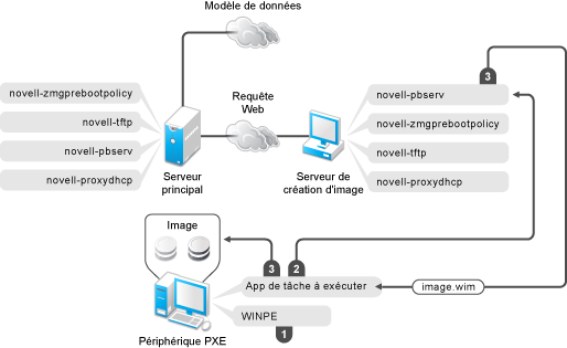 Une fois le programme Bootstrap des services de pré-lancement téléchargé et exécuté, le périphérique consulte novell-zmgprebootpolicy sur le satellite de création d'image à la recherche d'un travail de création d'image à exécuter.