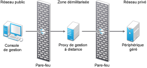 Vous devez installer le proxy sur un périphérique situé dans une zone démilitarisée. Le périphérique sur lequel vous installez le proxy doit être accessible depuis le réseau public qui comporte la console de gestion et doit avoir accès à des périphériques relevant d'un réseau privé. Pour plus d'informations sur l'installation du proxy de gestion à distance, consultez la Section 2.10, Installation d'un proxy de gestion à distance.