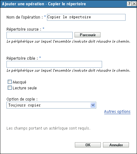 Répertoire cible : indiquez le chemin cible sur le périphérique dans lequel vous voulez copier le répertoire. Le chemin doit pouvoir être résolu par le périphérique sur lequel l'ensemble est exécuté.