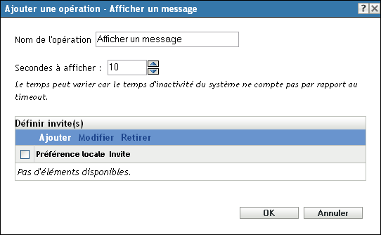 La boîte de dialogue Opération - Afficher un message permet de spécifier un message à afficher sur les périphériques lorsque l'opération est effectuée.