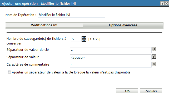 La boîte de dialogue Opération - Modifier le fichier INI permet d'indiquer un fichier et de configurer la liste des modifications à effectuer sur le fichier. Vous pouvez également créer un fichier s'il n'existe pas.