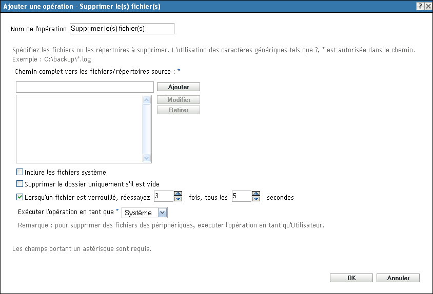 Exécuter l'opération en tant que : indiquez (par défaut) ou dans la liste . Indiquez si la suppression des fichiers nécessite l'accès à toutes les zones du système de fichier du périphérique. Si vous utilisez des unités réseau assignées pour indiquer des fichiers et des répertoires, vous devez exécuter l'opération en tant qu'.