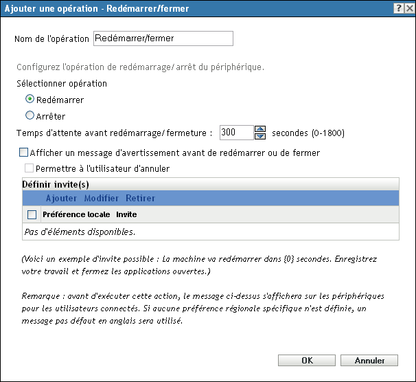 Permettre à l'utilisateur d'annuler : spécifiez si l'utilisateur peut annuler la procédure de redémarrage ou d'arrêt.