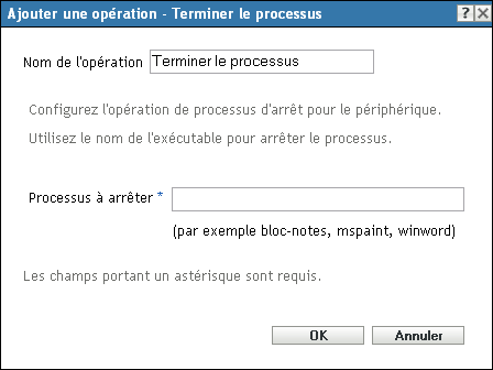 La boîte de dialogue Opération - Terminer le processus permet d'indiquer le nom de l'exécutable du processus que vous voulez arrêter (par exemple, bloc-notes, mspaint, winword, etc.). Si le processus n'est pas en cous d'exécution sur le périphérique, la tâche Terminer le processus s'arrête.