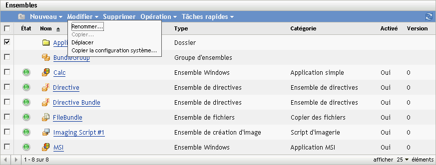 Utilisez la liste déroulante de la page Ensembles pour éditer un objet. Pour accéder à la liste déroulante , vous devez sélectionner l'objet en cochant la case située en regard de son nom dans la liste.