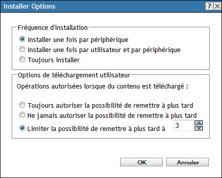La boîte de dialogue Options d'installation permet de spécifier la fréquence à laquelle les opérations d'installation de l'ensemble sont effectuées sur les périphériques gérés et d'indiquer si les utilisateurs peuvent différer l'installation de l'ensemble.