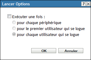 La boîte de dialogue Options de lancement permet de configurer la fréquence des opérations de lancement des ensembles sur les périphériques gérés. Par défaut, les opérations de lancement s'effectuent selon la planification de l'ensemble ou lorsque l'utilisateur lance l'ensemble à l'aide d'un raccourci (depuis la fenêtre de l'application, le bureau, etc.).