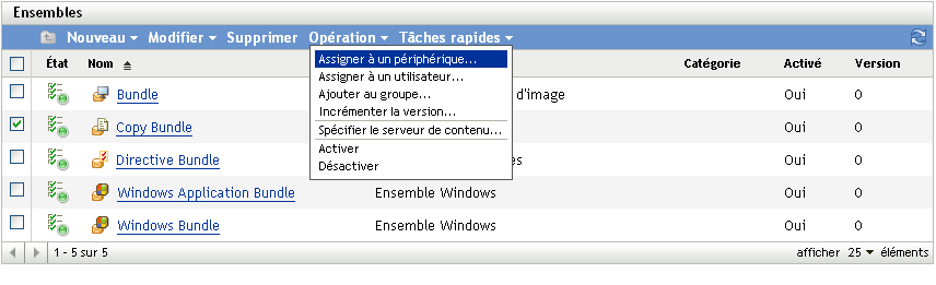 Vous pouvez utiliser le Centre de contrôle ZENworks ou l'utilitaire de ligne de commande zman pour assigner des ensembles. La procédure suivante explique comment assigner un ensemble à l'aide du Centre de contrôle ZENworks. Si vous préférez l'utilitaire de ligne de commande zman, reportez-vous à la section Commandes d'ensemble