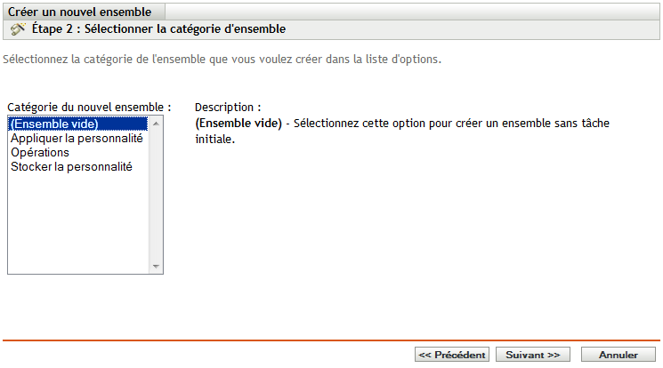 Ensemble vide : un ensemble sans tâche initiale. Cette catégorie est pratique pour créer rapidement un ensemble sans effectuer toutes les tâches de l'assistant Créer un nouvel ensemble. Après avoir créé l'ensemble vide, vous pouvez en éditer les détails pour ajouter des assignations, des opérations, etc., ultérieurement.