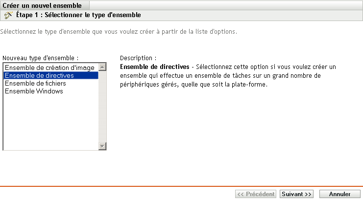 Nom de l'ensemble : saisissez le nom de l'ensemble. Le nom de l'ensemble doit être différent de celui d'un autre élément quel qu'il soit (ensemble, groupe, dossier, etc.) se trouvant dans le même dossier. Le nom que vous fournissez s'affiche dans le Centre de contrôle ZENworks et dans ZENworks Adaptive Agent (sur les périphériques gérés).