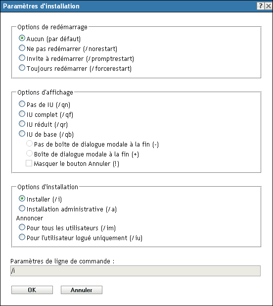 Affiche les paramètres de ligne de commande d'installation utilisés au cours de l'installation de l'application. Lorsque vous sélectionnez des options de redémarrage, d'affichage et d'installation, les paramètres de ligne de commande de ce champ sont remplis automatiquement.