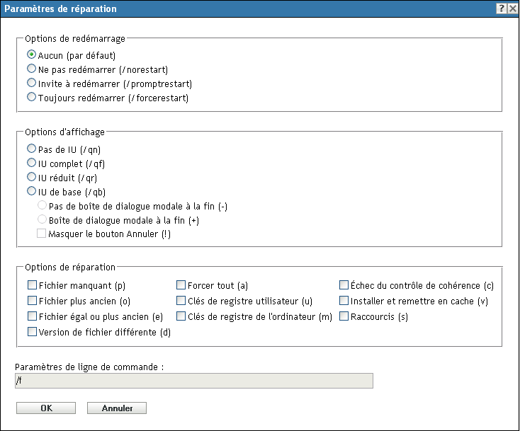 IU complète (/qf) : répare l'application avec l'interface utilisateur complète ainsi qu'une boîte de dialogue modale affichée à la fin du processus.