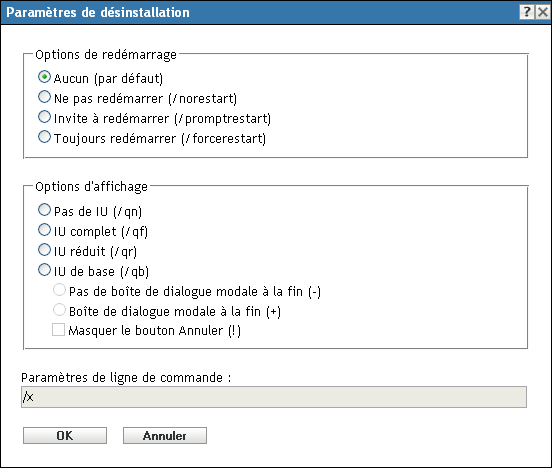 Pas de boîte de dialogue modale à la fin (-) : affiche une interface utilisateur de base sans boîte de dialogue modale affichée à la fin de la désinstallation.