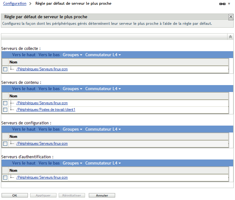 La règle par défaut de serveur le plus proche permet de définir la règle utilisée par un périphérique pour déterminer les serveurs d'authentification, de collecte, de contenu et de configuration les plus proches lorsqu'aucune des règles de serveur le plus proche n'a été définie ou qu'aucune ne s'applique. Cette règle est une simple liste des serveurs dans l'ordre dans lequel vous voulez que les périphériques les contactent. Vous ne pouvez pas ajouter ni retirer des serveurs des listes.