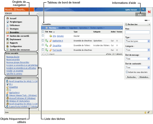 Liste des tâches : la liste des tâches affichées dans le volet de gauche permet d'accéder rapidement aux tâches les plus courantes de la page actuelle. La liste des tâches change pour chaque page. Par exemple, celle qui est accessible dans la page Ensembles comprend les tâches associées à des ensembles, et celle qui est accessible dans la page Périphérique, les tâches associées aux périphériques.