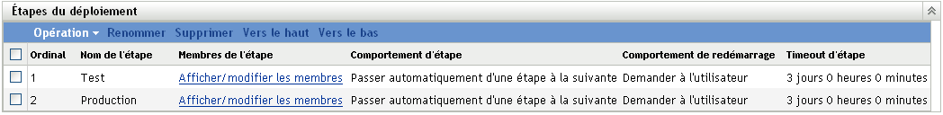 Si vous devez réorganiser la séquence des étapes de déploiement, sélectionnez une étape, puis cliquez sur ou sur .