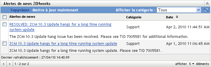 Dans le panneau Alertes de news ZENworks, sélectionnez une catégorie dans la liste déroulante située en regard du texte pour afficher toutes les alertes de news en fonction de la catégorie sélectionnée.