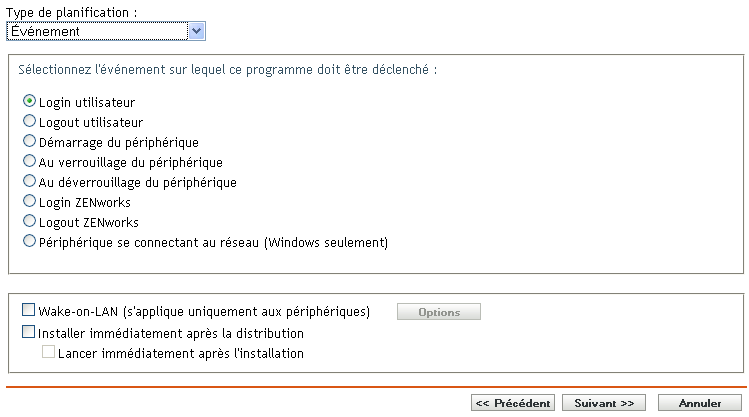 Cette option de planification permet d'indiquer l'événement que vous voulez pour déclencher l'opération planifiée.