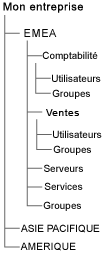 Supposons que vous voulez permettre à tous les utilisateurs des conteneurs Comptabilité et Ventes de recevoir du contenu ZENworks. De plus, vous voulez être en mesure d'accéder aux groupes d'utilisateurs qui se trouvent dans les conteneurs Comptabilité, Ventes et Groupes afin de distribuer le contenu en fonction de ces groupes. Pour accéder aux utilisateurs et aux groupes, vous avez deux possibilités : Supposons que vous vouliez exposer uniquement l'utilisateur et les groupes d'utilisateurs dans les conteneurs Comptabilité, Ventes et Groupes. Pour avoir accès à ces utilisateurs et à ces groupes, vous avez deux options :