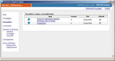 se trouve dans la zone de notification de Windows. Vous pouvez double-cliquer sur l'icône pour afficher les propriétés de ZENworks Adaptive Agent. Situé dans le volet de navigation de gauche, le lien Ensembles permet de voir les ensembles qui vous sont assignés et ceux qui sont assignés à votre périphérique.