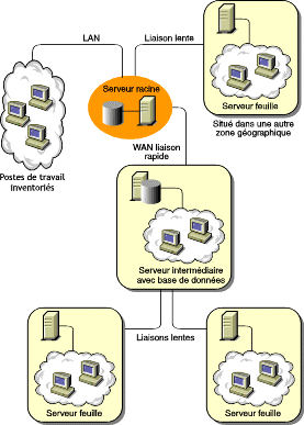 Dans cette configuration, les serveurs d'inventaire sont connectés au serveur intermédiaire par le biais de liaisons WAN lentes. Le serveur intermédiaire comporte également une base de données d'inventaire et transmet les informations au serveur racine. D'autres serveurs d'inventaire sont également connectés au serveur racine.