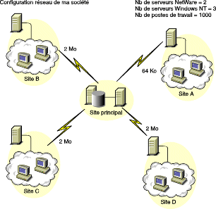 La figure suivante illustre l'organisation réseau d'une société qui dispose de serveurs en divers emplacements.