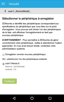 Dans un tel scénario, si l'option Autoriser le rapprochement manuel par l'utilisateur est permise dans la stratégie d'enregistrement mobile et si le rapprochement échoue, ZENworks envoie un courrier électronique à l'utilisateur pour terminer le processus d'enregistrement. Lorsque l'utilisateur visite à nouveau le portail utilisateur ZENworks pour terminer l'enregistrement ActiveSync, il doit sélectionner le type approprié de propriété du périphérique. Ensuite, le portail utilisateur ZENworks répertorie tous les appareils Android actifs associés à l'utilisateur qui sont enregistrés dans la zone de gestion ZENworks. L'utilisateur peut sélectionner le périphérique approprié pour le rapprocher manuellement avec l'objet Périphérique existant. Il peut également sélectionner l'option Enregistrer comme nouveau périphérique. Cliquez sur Continuer.