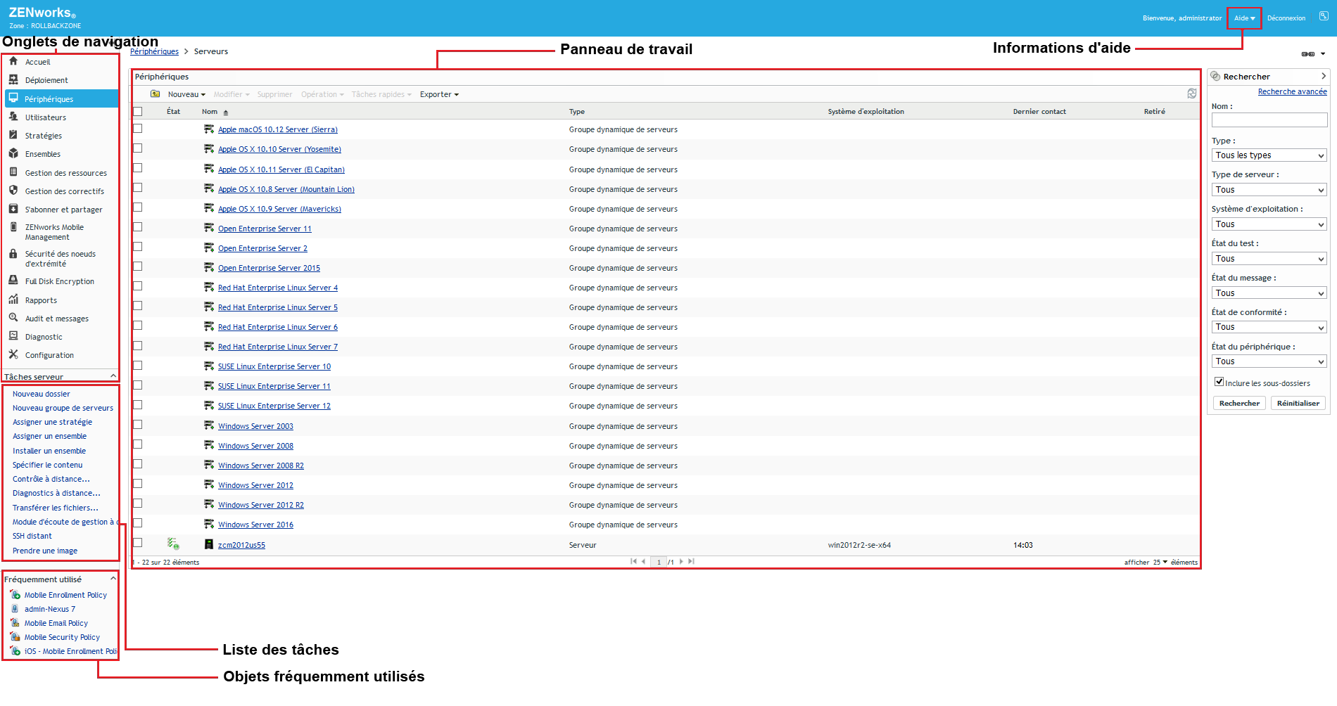 Tableau de bord de travail : les tableaux de bord de travail permettent de surveiller et de gérer le système ZENworks. Le contenu et l'apparence des panneaux varient selon la page en cours. L'exemple ci-dessus comporte deux panneaux de travail : Périphériques et Rechercher. Le panneau Périphériques liste les serveurs, dossiers et groupes de serveurs (dynamiques ou non) créés et vous permet de gérer les serveurs. Le panneau Rechercher permet de filtrer le contenu du volet Périphériques selon des critères spécifiques comme le nom, le système d'exploitation ou l'état d'un serveur.