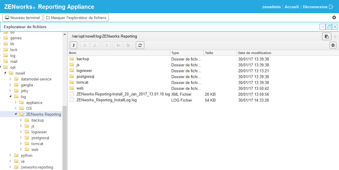 Tous les fichiers journaux surveillés dans l'applicatif ZENworks Reporting sont organisés en arborescence virtuelle et le chemin d'accès au fichier ou au dossier particulier est affiché. Les fichiers journaux peuvent être affichés en mode de suivi ou en mode Afficher depuis le début.